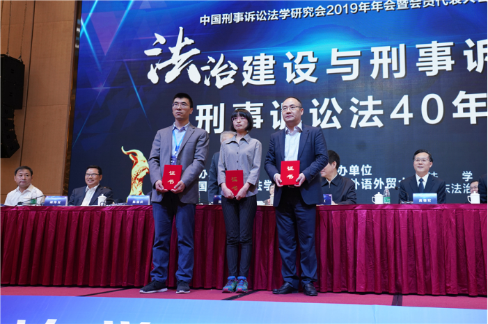 王其江表示,过去一年中,中国刑事诉讼法研究会在法学研究、资政建言、境内外学术交流、分支机构建设等方面做了许多卓有成效的工作。他对研究会提出三点期望:一是深入学习贯彻党的十九届四中全会精神,将习近平总书记全面依法治国新理念、新思想、新战略作为全面推进我国刑事诉讼法治建设和法学研究的行动指南。二是积极服务党和国家工作大局,发挥研究会作为我国刑事诉讼法学高端智库作用,不断提升服务科学决策和法治实践能力水平。三是坚持立足中国国情和本土资源,坚持理论与实践的紧密结合,不断总结新中国成立70年来社会主义刑事程序法治建设的成功经验,不断完善和发展符合中国实际、具有中国特色、反映社会发展规律的刑事程序法制理论体系。  颁奖仪式