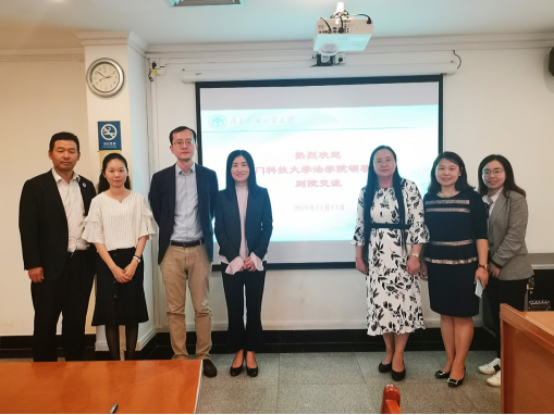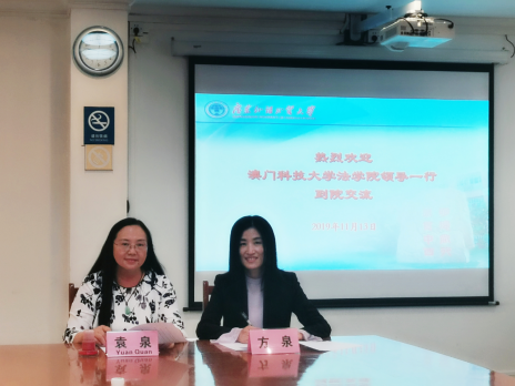 2019月11月13日下午,澳门科技大学法学院执行院长方泉教授、课程主任毕经纬老师及其他澳科大随行工作人员一行到访我院,与我院就签署两院交流合作协议事宜举行会谈。法学院院长袁泉教授、法学院副院长韩永红教授在行政楼第二会议室会见了来访嘉宾,学院法律硕士教育中心秘书彭雪婷陪同出席会议。