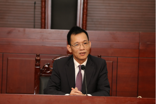桂锦波代表广州市司法局律师管理处对广东外语外贸大学法学院、广东涉外律师学院精心筹备本次培训表示感谢,对第二期的学员表示欢迎。他站在政府主管部门的角度、从国家发展、广州发展、律师本人发展的维度,分析了广州涉外法律服务的巨大需求和缺口。他希望借助广外外语、外贸、法学三大优势,为广州培养能够适应国际贸易、国际投资、国际交往需求的涉外法律服务人才。最后,他希望各位学员珍惜培训机会,学有所成。