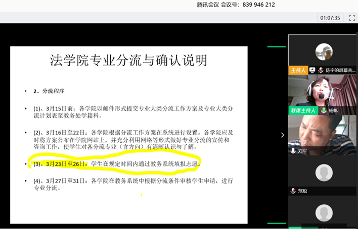 本网讯(文字:刘婕) 3月20日,法学院召开2019级专业分流线上说明会。本次会议的主持人是法学院副院长杨帆,法学院院长陈云良、学院党委书记王则唐、党委副书记刘军、法律系系主任张爽、知识产权系系主任卢纯昕、国际法系系主任梁晨、民商法系系主任杨浩楠以及法学院办公室和学工办的老师,以及全体2019级本科生参会。本次会议共分为三个环节,分别为法学院院长陈云良、党委书记王则唐、党委副书记刘军讲话,法学院副院长杨帆介绍专业分流方案,四位系主任介绍各个专业方向的特色和优势以及最后的交流环节。