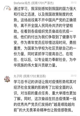 各党支部书记和支部委员精心组织,充分做好会前准备,会中引导,会后总结等工作,充分利用网络直播平台、微信公众平台、腾讯会议APP、QQ等线上平台,采用理论学习、主题讨论、交流讨论等形式分享对防疫抗疫情况的了解和感悟。