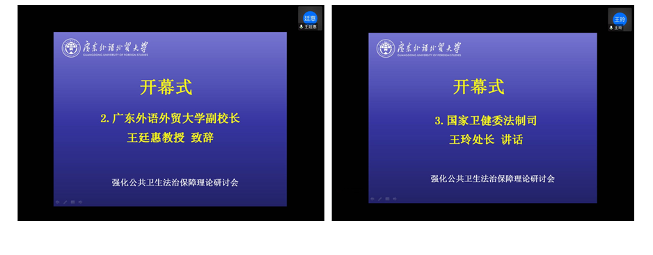 会议开幕式由广东外语外贸大学法学院院长陈云良教授主持,广东外语外贸大学副校长王廷惠教授致欢迎辞,国家卫健委法制司王玲处长为与会者介绍了国家公共卫生法治建设有关情况及未来发展方向。