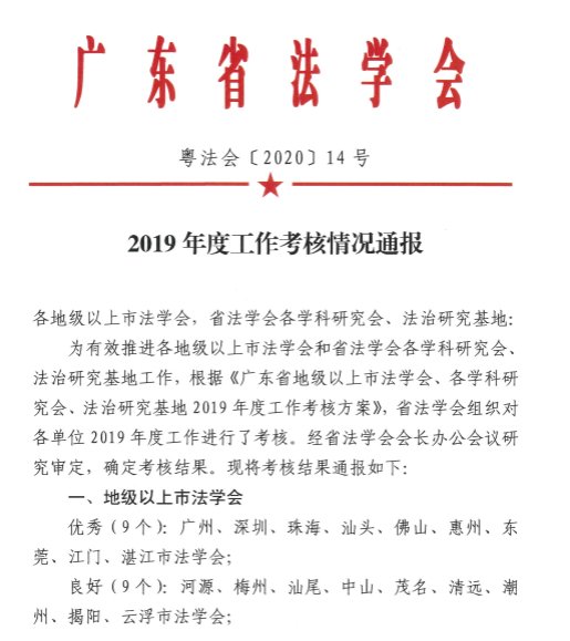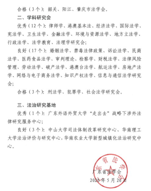 2020年5月26日,广东省法学会发文,公布了广东省地级以上市法学会、各学科研究会、法治研究基地2019年度考核结果。经过严格考核及省法学会会长办公会议研究审定,广东省法学会教育法学研究会、地方立法学研究会和广东外语外贸大学“走出去”战略下涉外法律研究服务中心三家单位被评为优秀。
