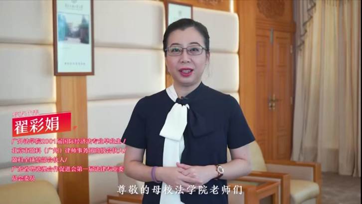 校友代表翟彩娟为毕业生送出了寄语:“我们需要认真地思考,用什么来在我们有限的青春里获得我们终生的价值。”“我们应该始终告诫自己,时刻尊重法律事实,恪守法律底线,我们即使不能开天辟地,但至少不能助纣为虐。只有这样,我们才能真正地为建设更美好的祖国明天,建设更加良好的法治社会,贡献自己应有的一份力量”。