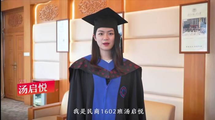 毕业生代表汤启悦回忆了在广外法学院成长的时光,表达了对母校师生的感谢之情,并送上了祝福:“四年前,我们被法律这柄重剑散发的光芒与神圣所吸引,自然也需要拥有捍卫法律尊严的过人勇气。我们无法预期后续的欢乐与艰难,但厚德明法、博稽中西的院训是支撑我们坚定内心的八字箴言,秉承内心深处的良知,保持冷峻理智的思考,培养行动的能力与坚持的勇气。”“仅代表所有法学学子对陪伴我们四年成长,为我们顺利毕业保驾护航的老师们说一句:老师,您辛苦了。”“2020年的夏天,我们从广外出发,迈向人生新的征程。愿我们历尽千帆,归来仍是少年!”