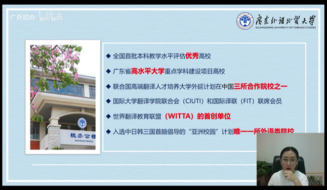 我校招办主任姜琳教授主讲的题为“遇见广外,预见未来”的招生宣讲,围绕学校概况、师资情况、学科实力、人才培养、国际交流与合作、就业情况、升学情况、校园生活、广外校友及今年的招生政策进行讲解,并对学生或家长在线上提出的问题进行解答。她指出,广东外语外贸大学是全国首批本科教学水平评估优秀高校,是广东省高水平大学重点学科建设项目高校,国家级一流本科专业建设点位列广东省属高校第一,我校在专业建设上呈现出外语专业与非外语专业双轮驱动的发展模式。在人才培养方面,姜主任对学分制管理、大类招生、特色型创新班尤其是国际组织创新班以及实践教学进行了具体介绍。