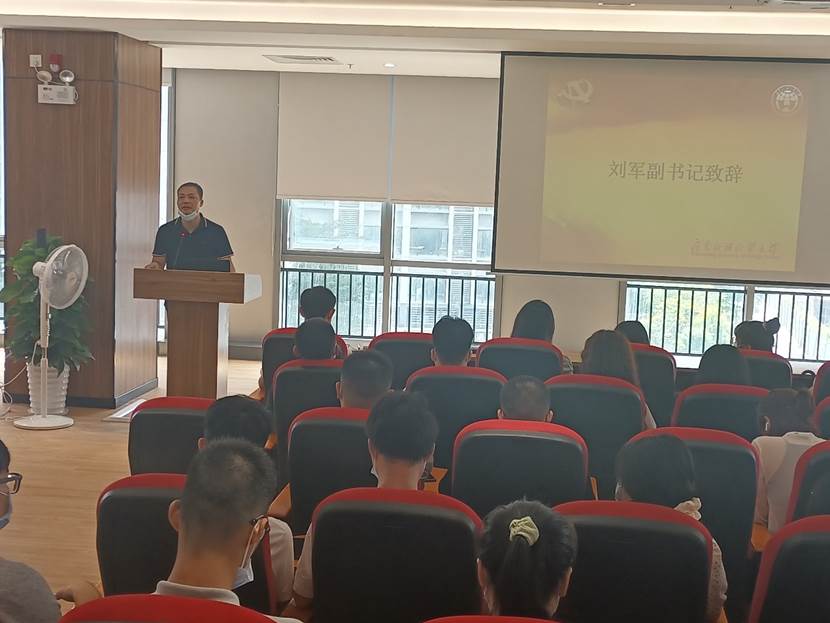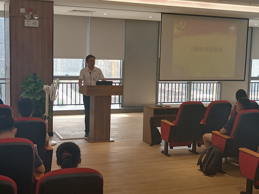王则唐书记鼓励同学们争做一名具有家国情怀、国际视野、法治信仰、理性思维、实干精神、健康身心的“六有”好青年。他指出,作为第一批入驻知识城校区的2020级新生,要把精力聚焦在专业学习上,最大限度地利用中新知识城的优质企业资源,更好地搭建产学研的桥梁,使理论知识更好地服务于实践,促进理论与实践的相互增长。他表示新校区的建设也一直在路上,学校和学院一直都在尽最大努力完善细节,更好地为同学们的生活、学习服务,朝着更加便捷,更加舒适,更加优质的教学、生活保障前进。
