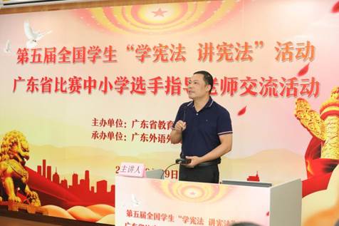 9月29日,第五届全国学生“学宪法讲宪法”广东省中小学选手指导老师交流培训活动在我校北校区第九教学楼顺利举行。本届活动由广东省教育厅主办,广东外语外贸大学承办。广东省教育厅政策法规处干部李鹏飞、我校法学院党委副书记刘军、法学院、广东法治研究院潘高峰教授等相关领导老师出席了活动。这将是我校第三次承办全国学生“学宪法讲宪法”的广东省系列比赛活动。