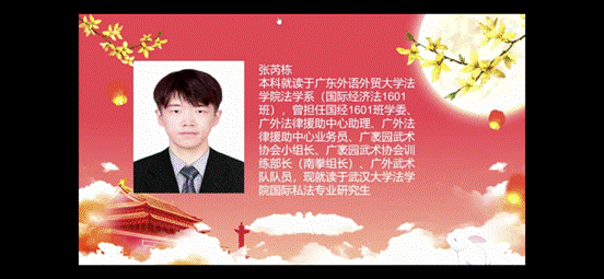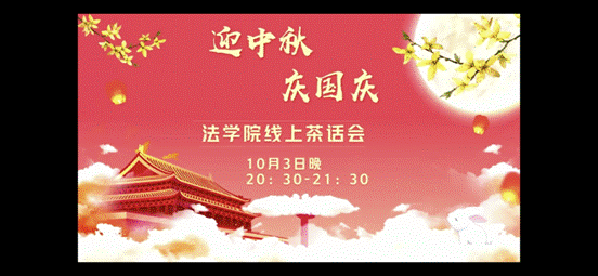 (文字:傅以琳 图片:傅以琳)10月3日晚,我院“迎中秋 庆国庆”线上茶话会暨法律职业生涯报告会通过腾讯会议顺利开展,茶话会邀请到优秀毕业生代表、武汉大学法学院研究生张芮栋和北京大学国际法学院研究生郑羽。各年级辅导员、学院2017-2020级学生参加了会议,会议由2020级辅导员韩金彪主持。