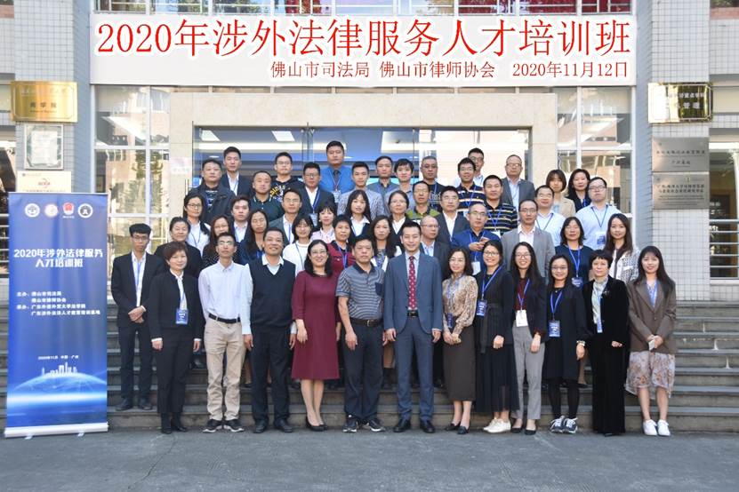 2020年11月12日-13日,由佛山市司法局、佛山市律师协会主办,广东外语外贸大学法学院、广东涉外法治人才教育培训基地承办的“2020年涉外法律服务人才培训班”在广东外语外贸大学北校区九教103丝纺讲堂举行。广东省佛山市律师协会涉外法律专业委员会主任副主任曹永明、广东省佛山市律师协会副秘书长杨志生、广外法学院党委副书记刘军、广东涉外法治人才培训基地副主任杨桦、华南国际知识产权研究院副院长常廷彬教授以及50名来自佛山的律师学员参加了本次培训班的开班仪式。开班仪式由广东涉外法治人才培训基地副主任杨桦教授主持。