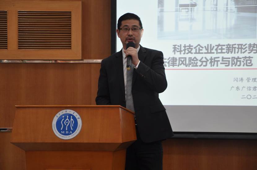 11月12日下午,广东广信君达律师事务所管理合伙人、高级合伙人闪涛律师为学员授课。闪涛律师主要以中美为背景,以热点案例为切入点,为学员分析了新形势下经贸投资领域的风险等内容。