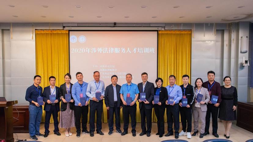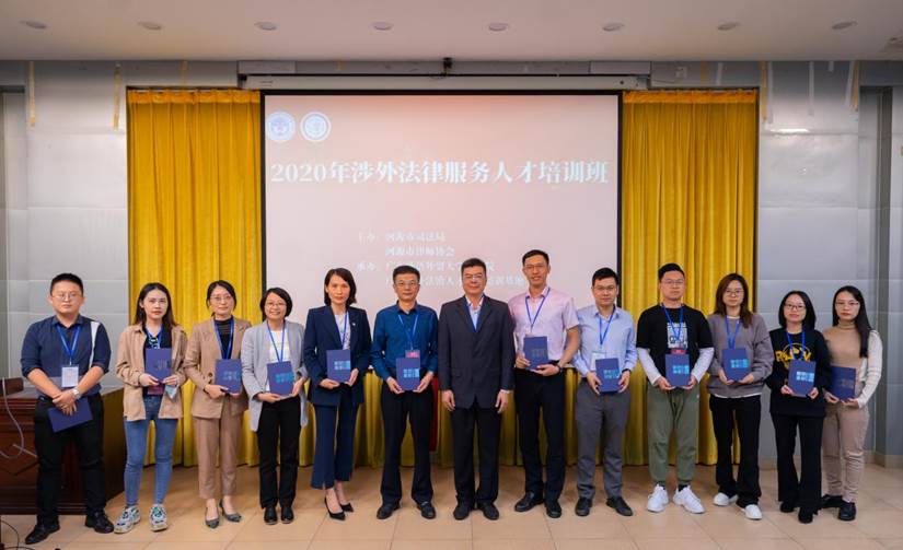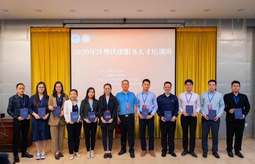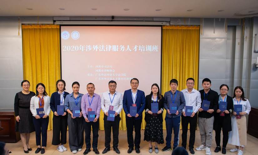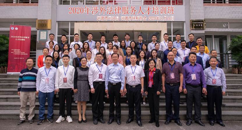 2020年11月13日-15日,由河源市司法局、河源市律师协会主办,广东外语外贸大学法学院、广东涉外法治人才教育培训基地承办的“2020年涉外法律服务人才培训班”在广东外语外贸大学白云山校区七教水上报告厅举行。广东省河源市司法局副局长刘军、广东省河源市律师协会会长叶勇、广东外语外贸大学法学院党委书记王则唐、广东涉外法治人才培训基地副主任杨桦以及50名来自河源市的律师学员参加了本次培训的开班仪式。开班仪式由广东涉外法治人才培训基地副主任杨桦教授主持。
