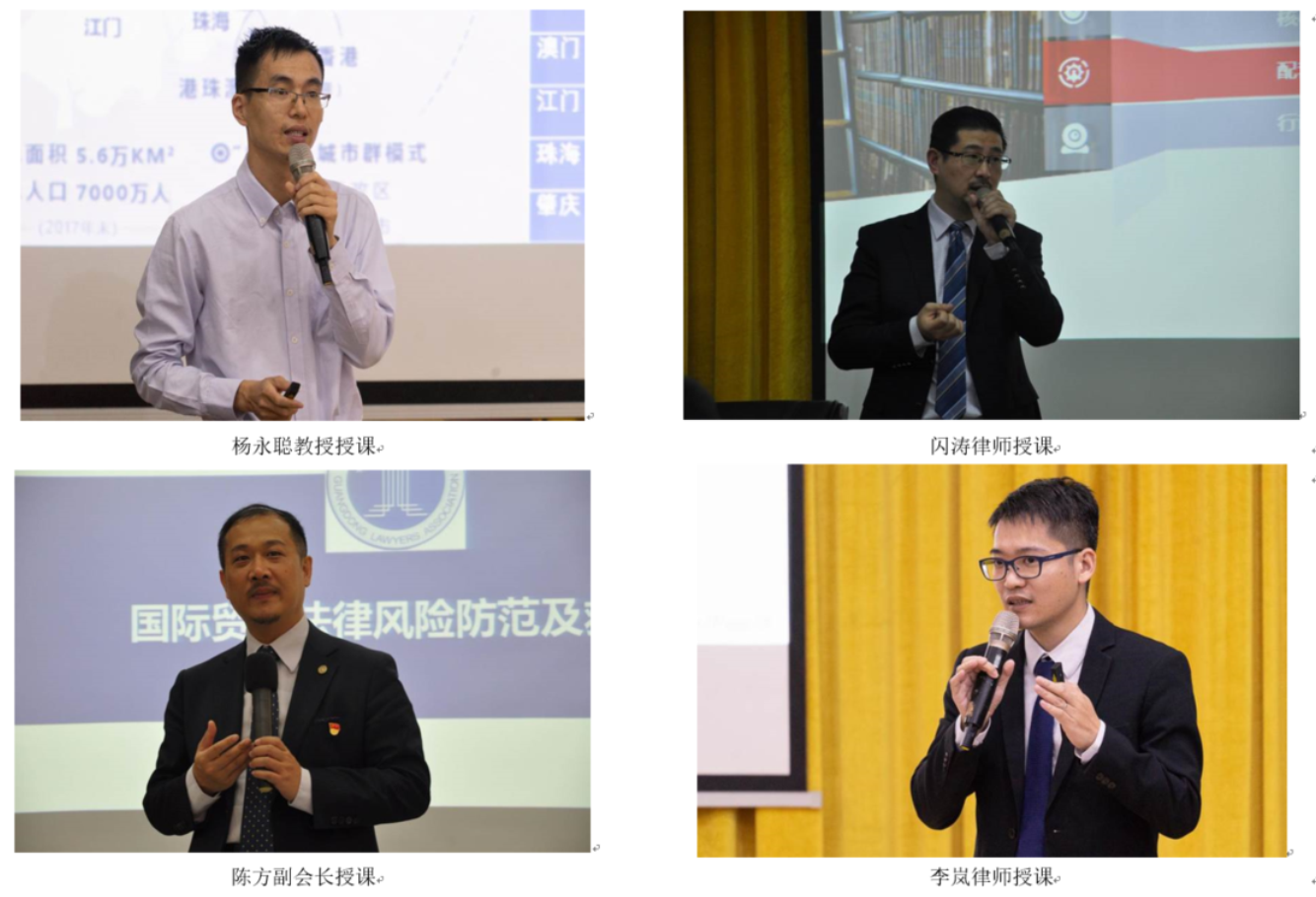 在两天的培训课程中,广东外语外贸大学粤港澳大湾区研究院副院长、全国港澳研究会会员杨永聪教授为学员们重点解读了粤港澳大湾区的各方面政策;广东广信君达律师事务所管理合伙人、高级合伙人闪涛律师以中美为背景,以热点案例为切入点,为学员分析了新形势下经贸投资领域的风险;广东省律师协会副会长陈方律师为学员们分析国际贸易的概况以及在新冠疫情背景下的国际贸易趋势,并讲解了相关的法律风险的防范及救济等内容;北京金诚同达(深圳)律师事务所合伙人、CLECSS 2017年十大杰出青年律师李岚为们讲解了英美诉讼与仲裁程序的主要差异,介绍了跨境争议解决程序等内容。