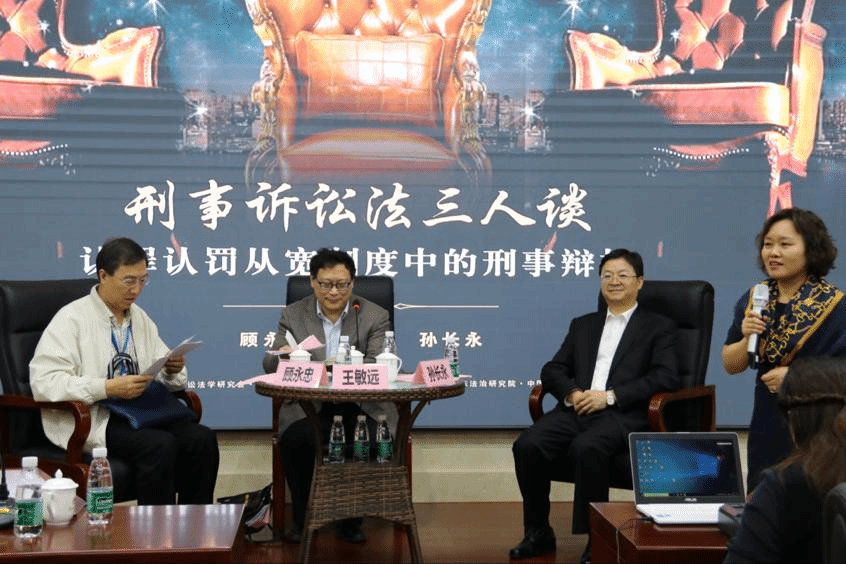 本次讲座以访谈的形式进行。王敏远教授作为访谈的主持人首先提出“现代刑事诉讼为什么要进行刑事辩护”的问题,顾永忠教授与孙长永教授分别进行了阐述,两位教授的内容虽然各有侧重,但是方向一致、精神相同。现代刑事诉讼控辩平等、控审分离、审判中立的构造,以及无罪推定的根本原则,决定了刑事辩护的重要性。刑事辩护可以防止刑罚权滥用,促进实体公正;保护诉讼过程中的基本人权,防止公民受到无根据的非法侵犯;强化政府惩罚的公信力,维护整个司法能够公正高效的运行。随后三位教授就认罪认罚从宽制度中的刑事辩护与普通刑事辩护的关系和特殊性方面展开探讨。