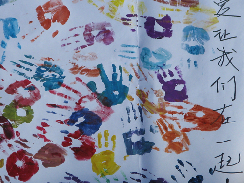 接下来是开学典礼的最后一个环节——“你我的承诺”盖手印活动,点燃了整个典礼的高潮。全体学生与义教老师用颜料把手掌涂满,把自己的掌印印在白纸上,作为大家全心全意、齐心合力做好此次义教活动的承诺。