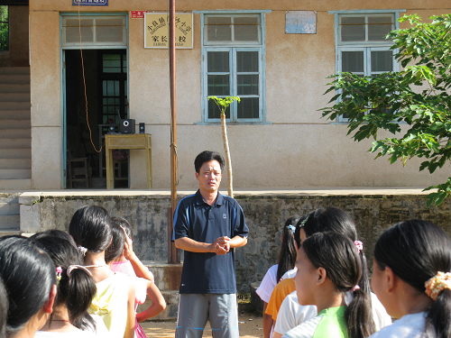 8时20分,白沙小学志愿参加暑期学习的同学均已到校,在操场排着整齐的队列静候典礼开始。8时30分,升旗仪式过后,开学典礼正式开始。队长贺婷婷首先向大家介绍了此次“三下乡”的队伍组成及具体活动安排,紧接着,由11名广外大法学院学生及8名华南农业大学学生组成的“梦起白沙”队队员轮流进行了自我介绍。此间,同学们都表现得十分热情,掌声非常热烈。
