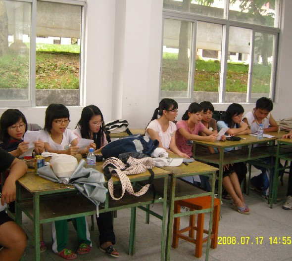 2008726,我们的大日子,十多天的努力终于要在这一天华丽上演啦。为尽量减少突发状况,我们在前一天晚上就组织队员进行了一次模拟演出,当天上午更是召集人马进行全真彩排。虽然场地很小,但催场人员、现场维持秩序人员、技术人员一个都不少,会场布置、演员道具也是毫不马虎,效果嘛,自然不言而喻,简直棒极了!用我们队长(委员长)宝佳同学的话来说,就是“En…good”。
