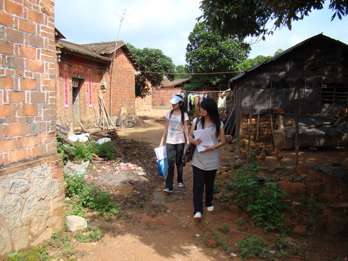 下午,没课的队友结伴同行,在队长婉华同志和小灿哥的带领下去熟悉这里的环境。这儿的村民真的很纯朴,很友善,只是随便地这么问一下路,阿婆就马上让他的小孙子给我们带路,没有问我们是从哪里来的,也没有想过我们是不是坏人。走出“迷宫”,还没来得及道一声谢,那小孩就微笑着跑开了,银铃般的笑声依旧回荡在空中。心突然感到一阵震撼。或许我们在城市里生活得太久了,渐渐被大众习俗同化了,如今我们回归到美好的世界中,去分享我们的梦想,感觉是少有的实在。
