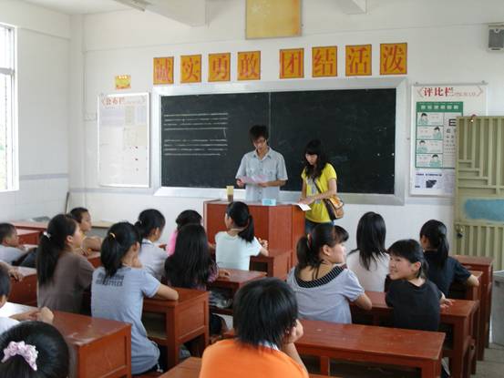 在简单而不失隆重的开学典礼过后,义教组的队员与学生们进行了第一次面对面的交流。首先,在义教队员的主持下学生们开展了第一次班会课,大家通过自我介绍对彼此有了初步的认识。然后,由学生们自荐或者推荐选出了各班的班长与纪律委员,同时对日后班内的工作进行初步安排。