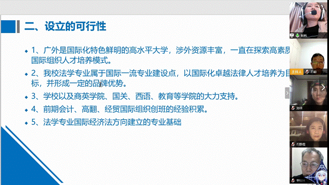 杨帆对法学国际组织创新班人才培养方案做了详细汇报,她结合中国参与全球治理背景、国际组织对法律人才的需求和广外的法学学科的优势,阐述了开设创新班的必要性、可行性,并重点汇报了创新班的培养目标以及课程特色。