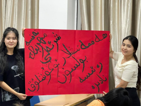 随后各小组合力完成一幅字画,让浓浓相思与真挚祝福从笔尖流出,刻画在鲜艳的纸张里。“人间共赏中秋月,酒社诗家意味长。”从特色民族语言到传统诗词对联,从泼墨画竹到玉兔相聚,无不透露出对美好生活的希冀与祝福,辅导员们也加入创作之中,与同学们共同用横竖撇捺驱散孤独寂寞之感,一时间墨香四溢,令人倍感温馨。同时,承载着关怀与温暖的月饼也纷纷送至同学们手中,希望月饼的甜能驱散思乡的苦,为同学们留下美好的回忆。其后来自新疆同学精彩绝伦的民族舞表演更是淋漓尽致地展现了特色民族风情,让大家大饱眼福。