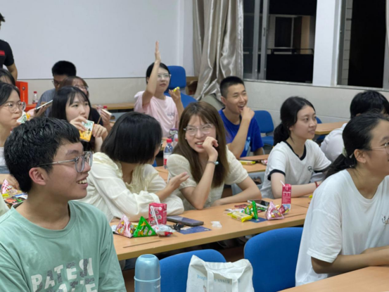 “月上梢头”篇章以两个趣味游戏调动同学们的积极性。同学们按行分组,在“看图猜成语”中积极抢答、充分热身,为随后的“猜灯谜”环节做好充分准备。从“猜字”“猜物”到“英文灯谜”,难度等级递增,游戏趣味性逐步增加。既贯彻“明德尚行、学贯中西”的校训,也让同学们在娱乐过程中学习新知,带领大家感受古代文人的风雅意趣、感受中华传统文化的独特魅力。