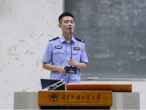 宣讲的最后,蔡警官以广外师兄的身份送给同学们三句寄语。分别为“法律是有温度的,法律亦是有尊严的”“你的优秀需要重新证明”“不负老一代广外人的努力”。隽语箴言直抵人心,激励同学们奋发向上,度过一个充实而有意义的大学生活。