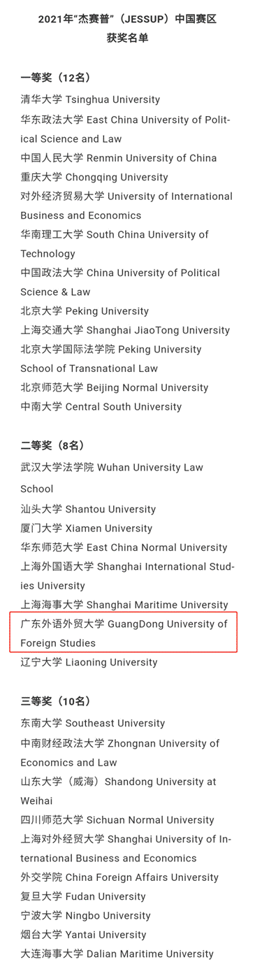 2021年3月15日至4月18日,由美国国际法学生联合会主办的“Jessup”国际法模拟法庭竞赛国际赛于线上举办。第十九届“Jessup”国际法模拟法庭竞赛中国赛区选拔赛因疫情原因取消,国内赛成绩将以在国际赛中中国赛队的成绩为基础得出排名及奖项。本届比赛共有来自全球的565支队伍同台竞技,经过Preliminary Rounds、Advanced Rounds、Elimination Rounds和Championship Round的激烈角逐,广外法学院代表队最终以国内排名第19名的成绩,荣获全国二等奖。