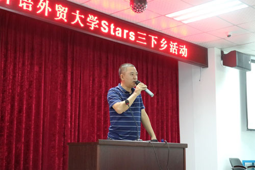 本次Stars三下乡服务队队长陈末作为队伍代表上台发言。她简要地介绍了队伍的口号和宗旨,并通过PPT为同学们展示队伍的成员和各自分工。队长的发言不仅拉近了队员与同学们之间的距离,更有利于同学们了解并配合我们三下乡的工作,可谓一举多得。