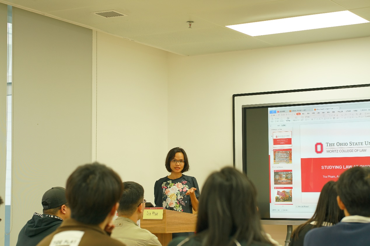 Tra Pham副院长结合自身的在美留学与工作经历,从生源多样性、校园环境、职业规划、城市区位等方面分析了俄亥俄州立大学法学院的特色优势,并具体介绍了俄亥俄州立大学面向合作院校学生提供的留学项目类别、申请条件、申请流程、学费标准以及奖学金优惠等重要信息。之后,针对现场同学提出的项目申请问题,Pham副院长给予了耐心细致的解答。