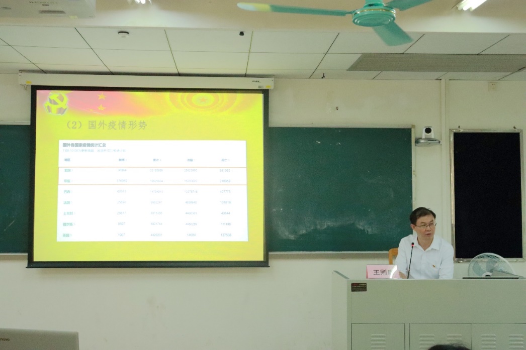 面对国内外的疫情形势,他根据网上资料,向同学们展示了中国、美国和印度的疫情防控数据对比。从这些数据上,不难得出:中国不仅取得了非凡的抗疫“战果”,守护了中国人民的生命安全,也为全球战“疫”作出了贡献。与此同时,他也强调,无论是从人性本身的角度,还是从“构建人类命运共同体”的角度来看,都不应该抱着看热闹的心态去看待国外疫情。这也正如习近平总书记在抗疫表彰大会上所说的,新冠肺炎疫情以一种特殊形式告诫世人,人类是荣辱与共的命运共同体,团结合作才是人间正道。