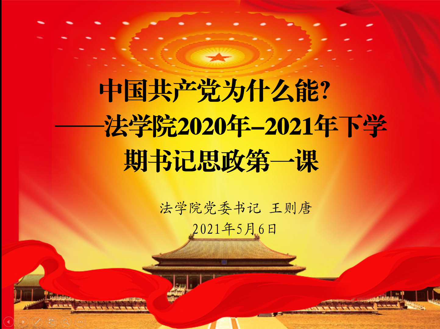为加强高校思想政治教育工作同党史学习教育有机结合,法学院党委书记王则唐在5月6日中午,为同学们开讲2020年-2021年下学期“思政第一课”。本次课程是以“中国共产党为什么能?”为主题,贯彻落实习近平总书记在党史学习教育动员大会上提出的“学党史、悟思想、办实事、开新局”的总体要求,扎实推进法学院党史学习教育。